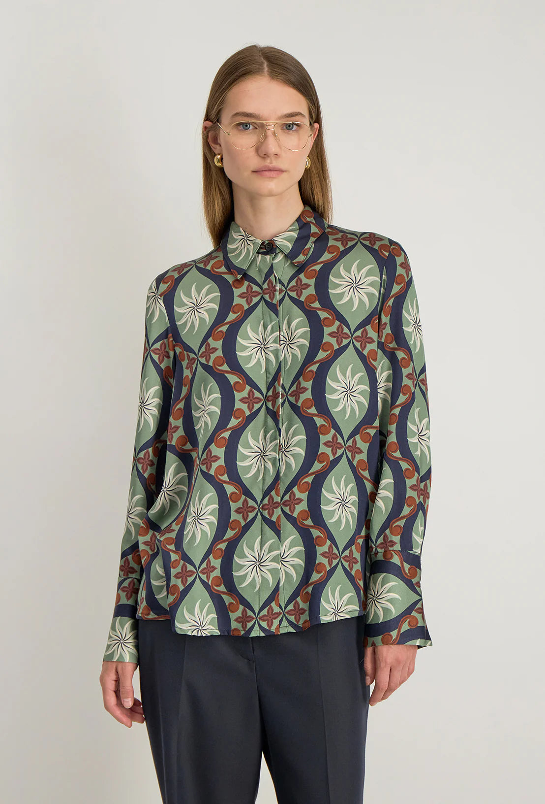 Camicia realizzata in un tessuto italiano, con stampa esclusiva realizzata da un modellista britannico con motivi di ispirazione anni '70. Camicia dal taglio dritto, con piega cava sul retro e maxi polsini camicia.