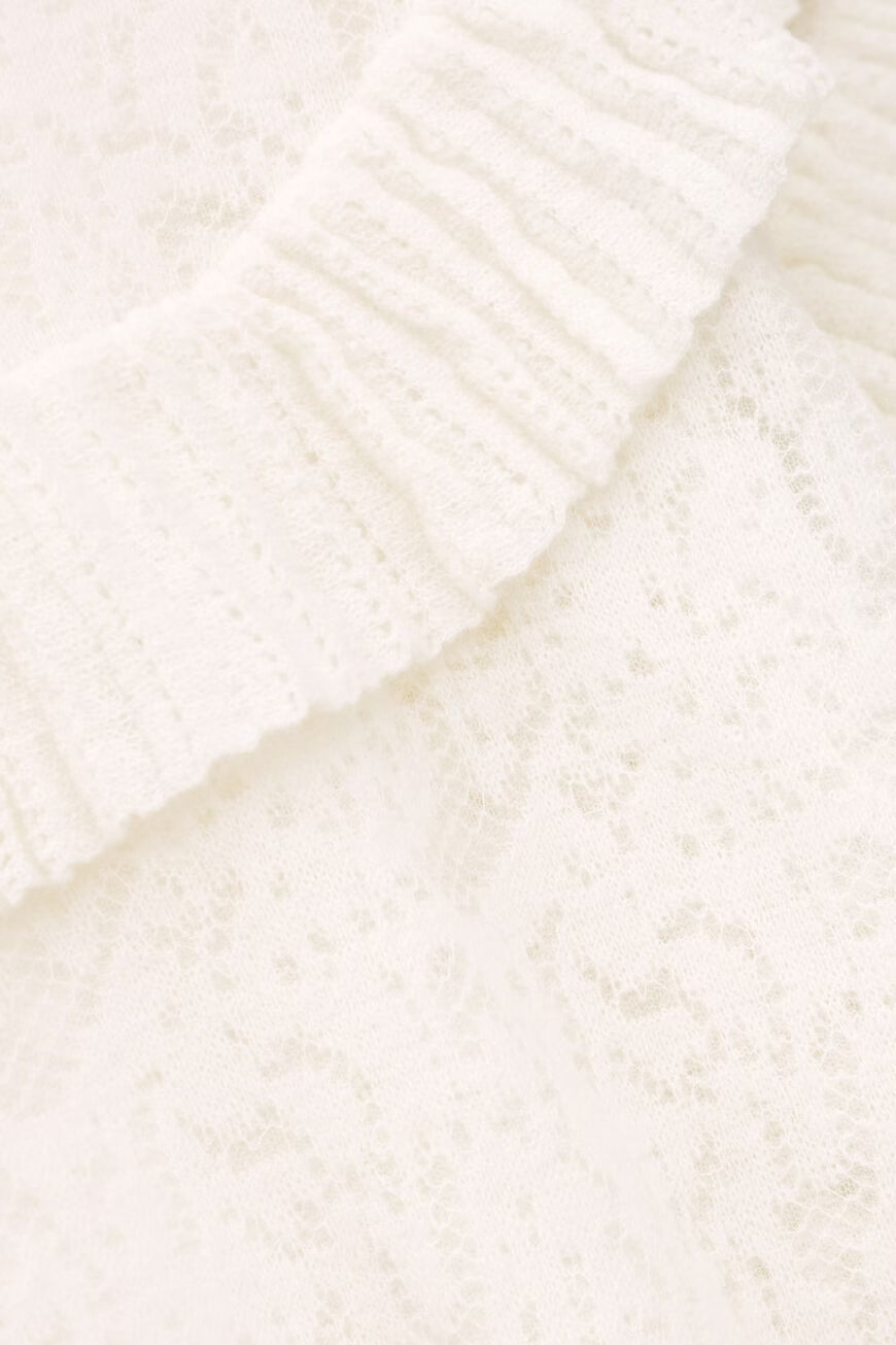 Maglia oversize con volant ed effetto pizzo jacquard. Scollo a V sulla schiena, reversibile. Maglia dallo stile senza tempo.