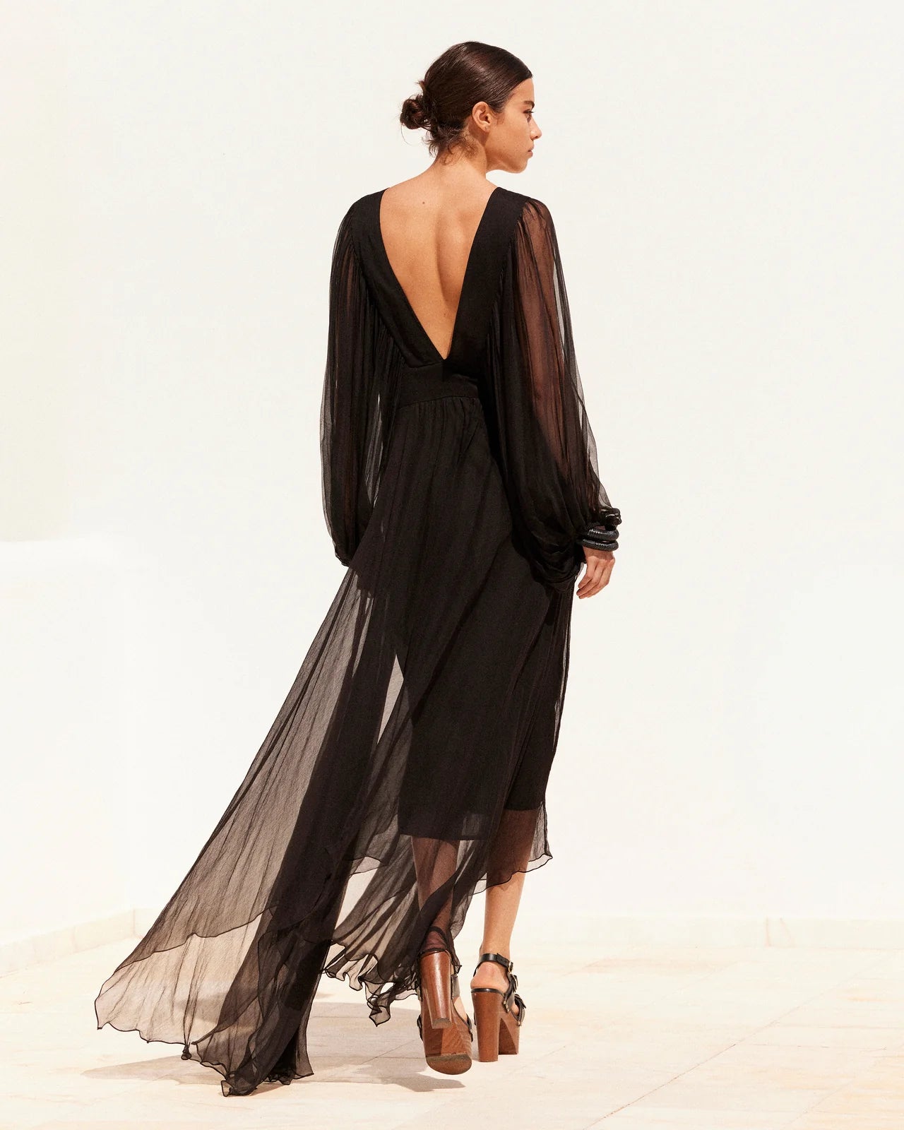 Abito lungo in chiffon di viscosa nero dalla silhouette fluida e ariosa. La profonda scollatura, sia davanti che dietro, accentua elegantemente il portamento della testa. Le maniche a sbuffo in voile trasparente aggiungono leggerezza e movimento, mentre le lunghezze asimmetriche si aprono in pannelli fluttuanti per un sottile gioco di trasparenze.