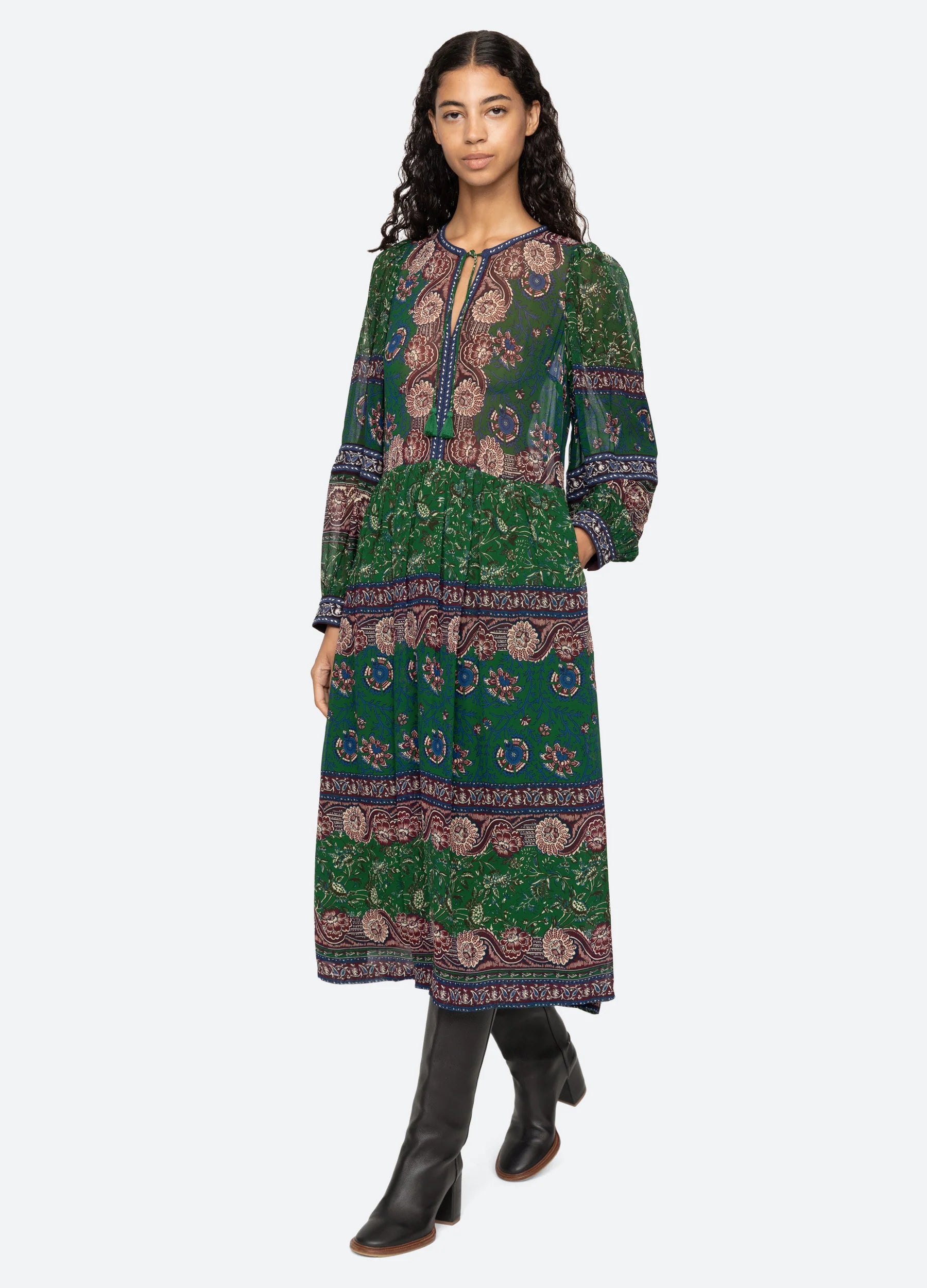 Abito midi con stampa floreale dal fascino vintage e la particolarità moderna. Lunghezza midi, stampa colorata, maniche voluminose e dettagli con nappe.