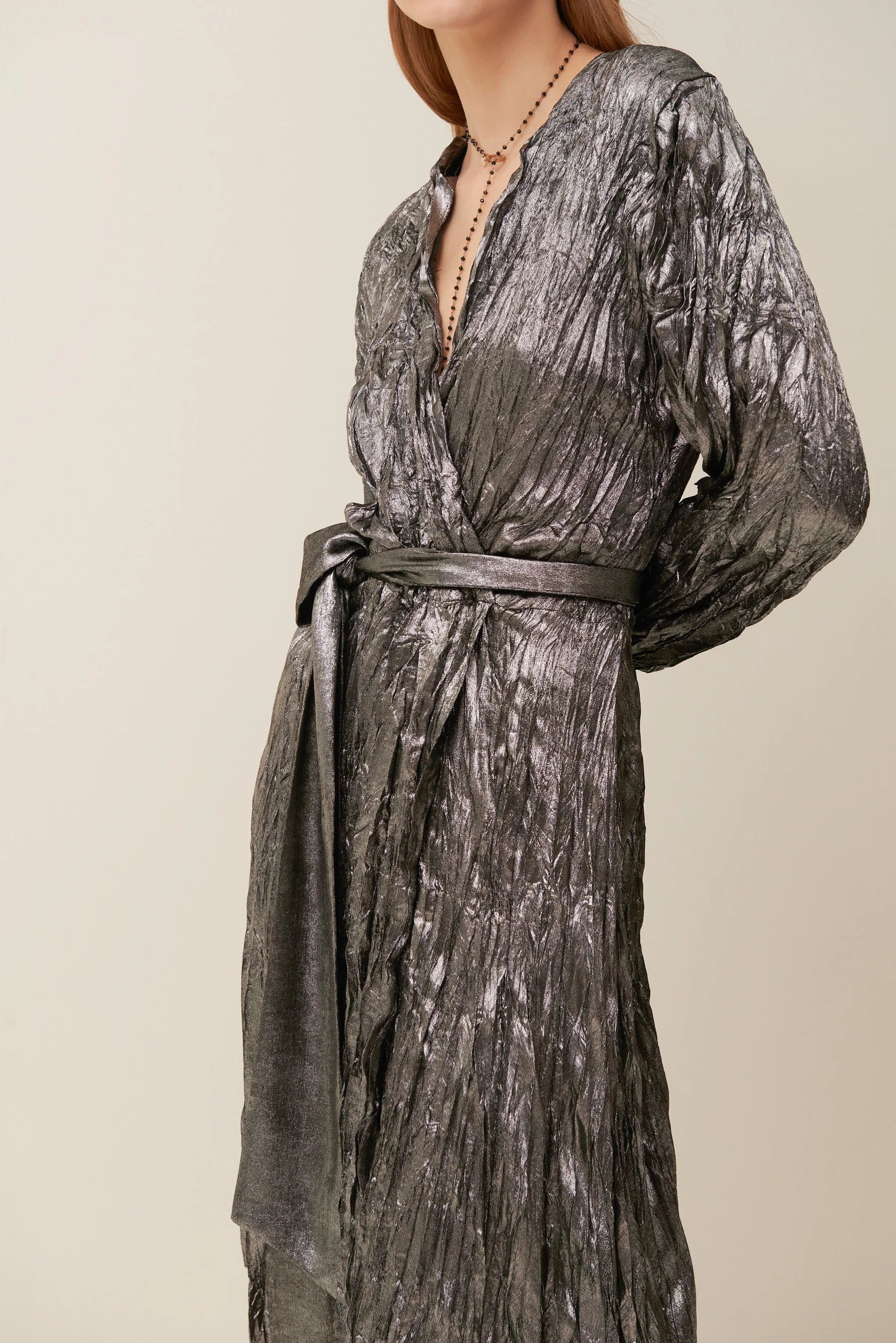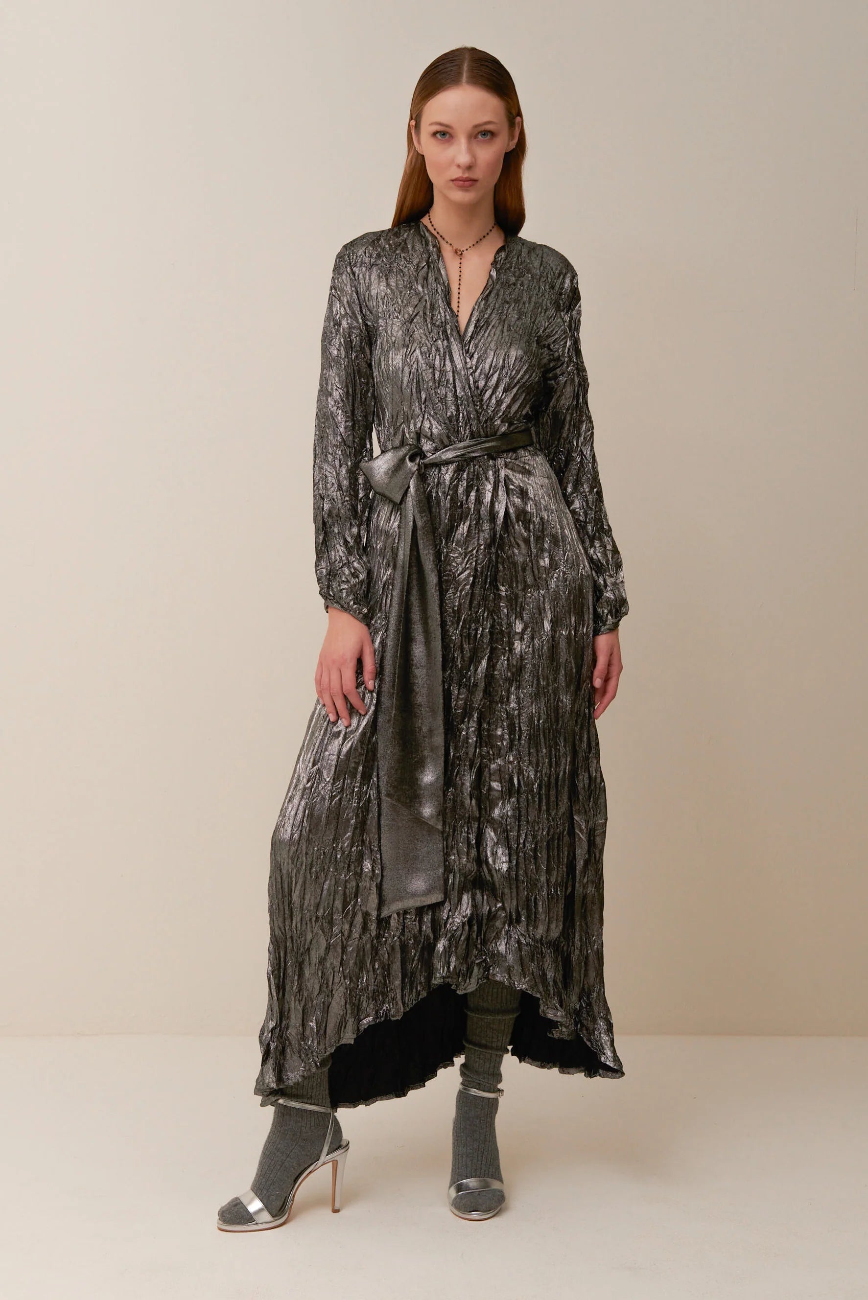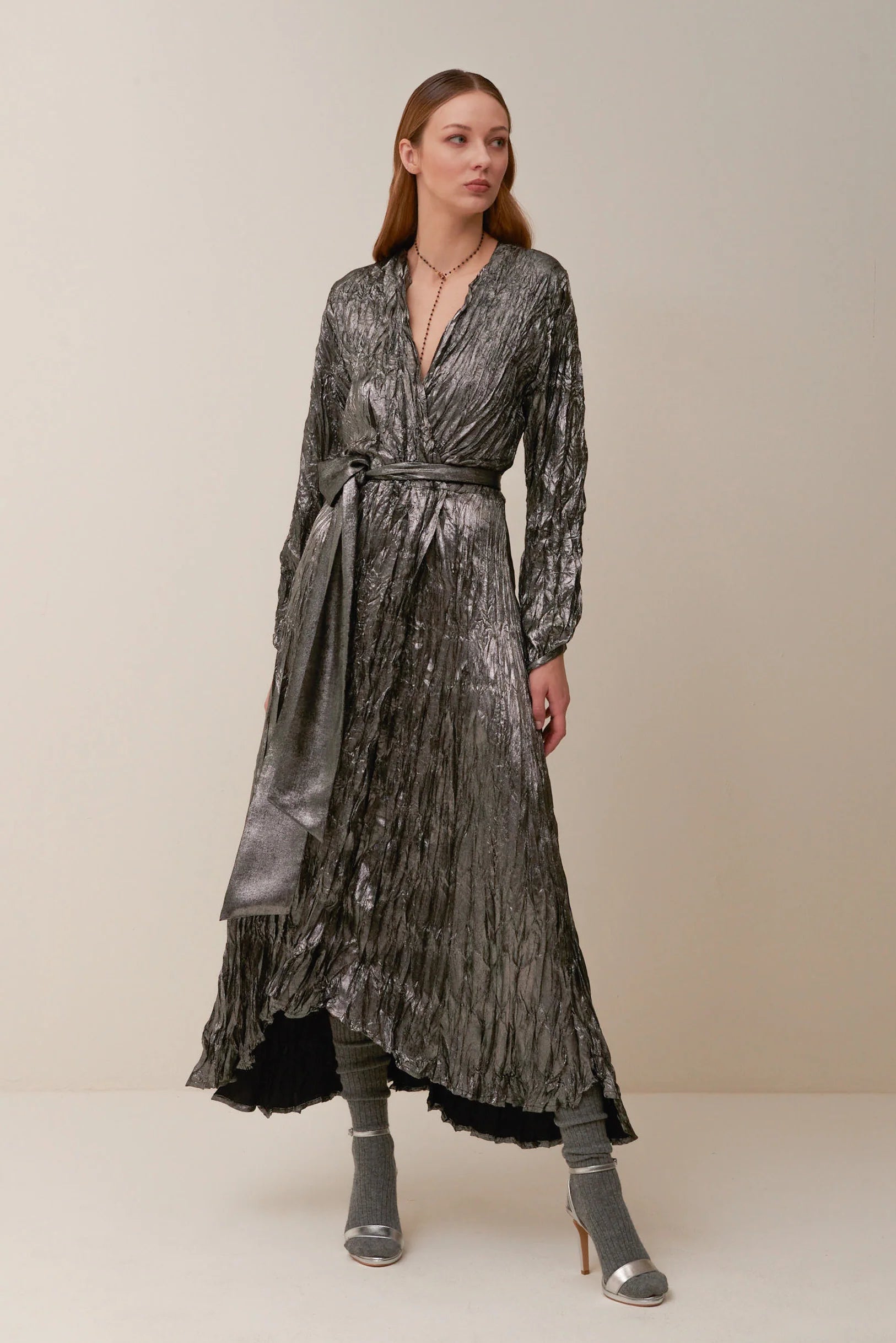 Abito svasato a portafoglio scollo a V in tessuto laminato plissettato effetto rughe.