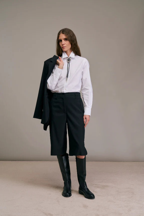 Bermuda realizzati in misto cotone. Vita media con passanti per cintura, tasche laterali e dettaglio piega sul davanti.