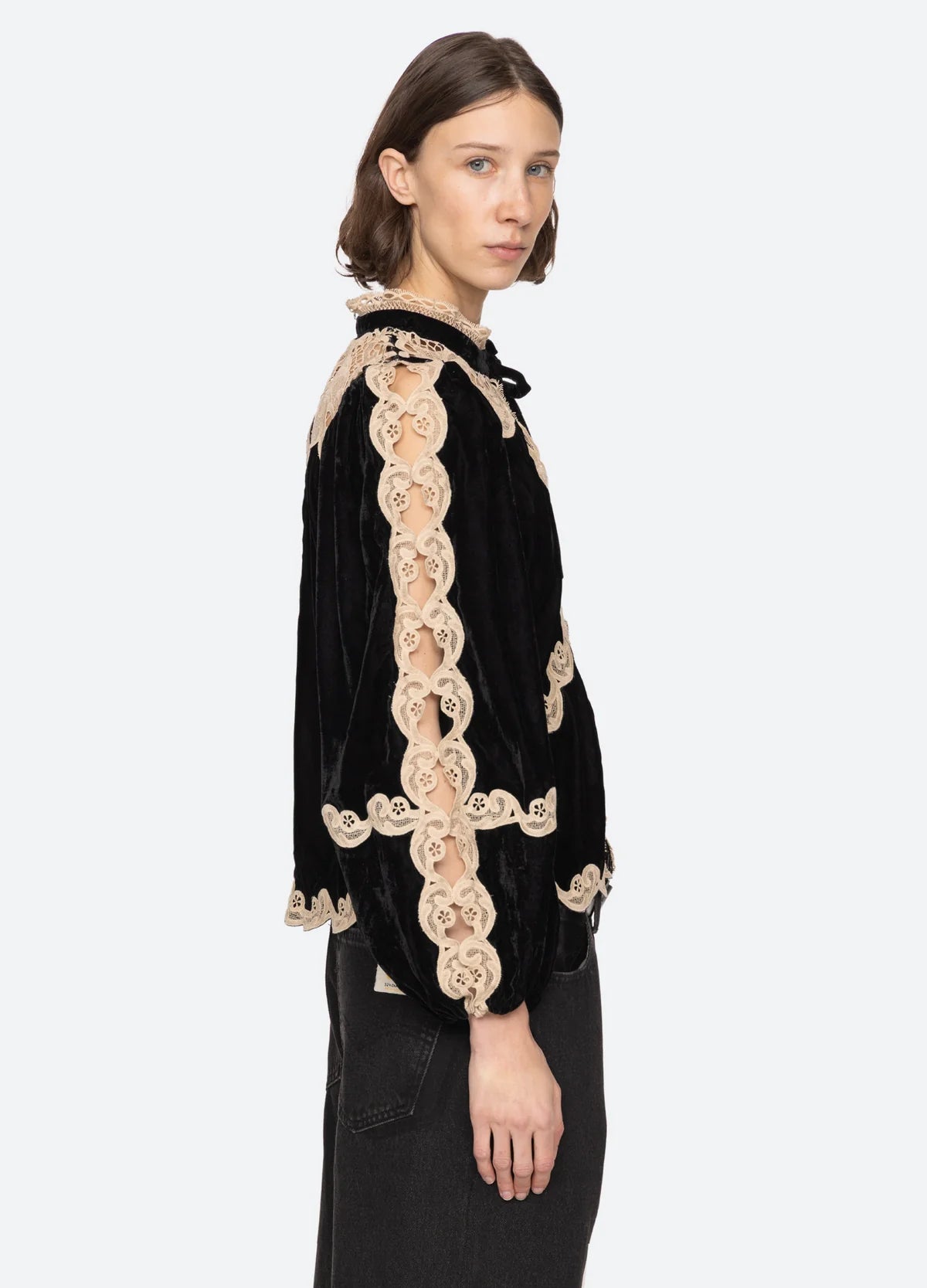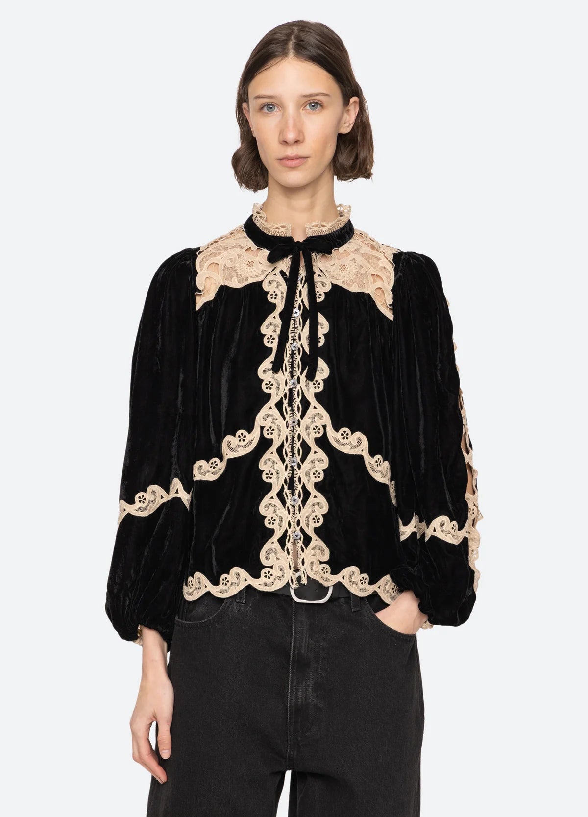 Top a maniche lunghe in pizzo intricato pizzo color crema su uno splendido velluto nero, crea un audace contrasto con il pizzo floreale di ispirazione vintage e i bordi smerlati. È rifinito con lunghe maniche a sbuffo e un collo alto impreziosito da un delicato fiocco per un tocco romantico.