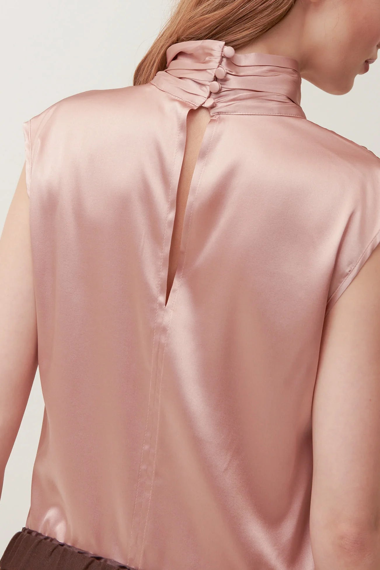Top con scollo a V e collo alto arricciato con dettaglio bottoni ricoperti in raso di seta stretch.